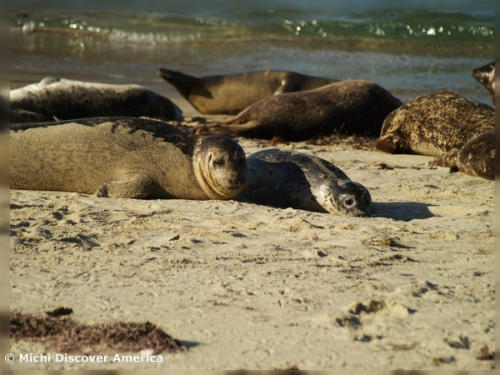 Diese Seelöwenkolonie liegt faul am Stand rum und sonnt sich. Nur die kleinen toben wie kleine Katzen rum und balgen sich.
